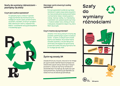 Szafka sąsiedzka to miejsce, gdzie możecie zostawić niepotrzebne, choć niezniszczone przedmioty. Możecie też szukać tam przydatnych rzeczy, zanim pójdziecie na zakupy. Zyska nasza planeta – mniej będzie śmieci!
